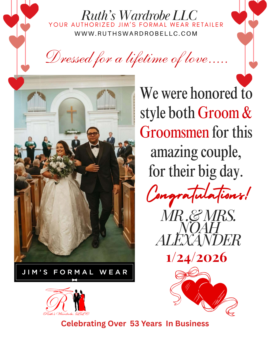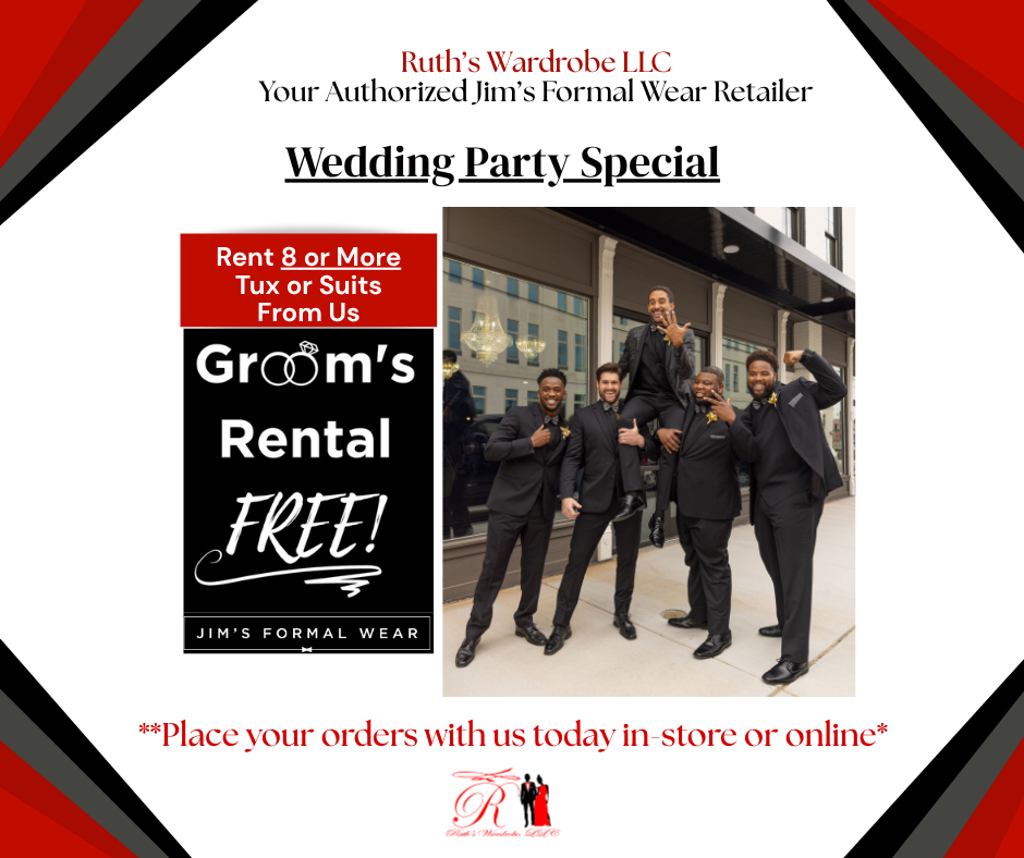 ● Stress-Free Formalwear for Grooms & Groomsmen – Wedding planning can be overwhelming, but choosing the right formalwear doesn’t have to be. At Ruth's Wardrobe LLC, we simplify the process with a curated selection of men’s suits and tuxedos for both grooms and groomsmen. Out of Town or Out of State Groomsmen? No worries we will be happy to assist you with your order and provide fitting consultations. All tuxs or suits will mailed directly to your wedding party. Fast shipping guaranteed.