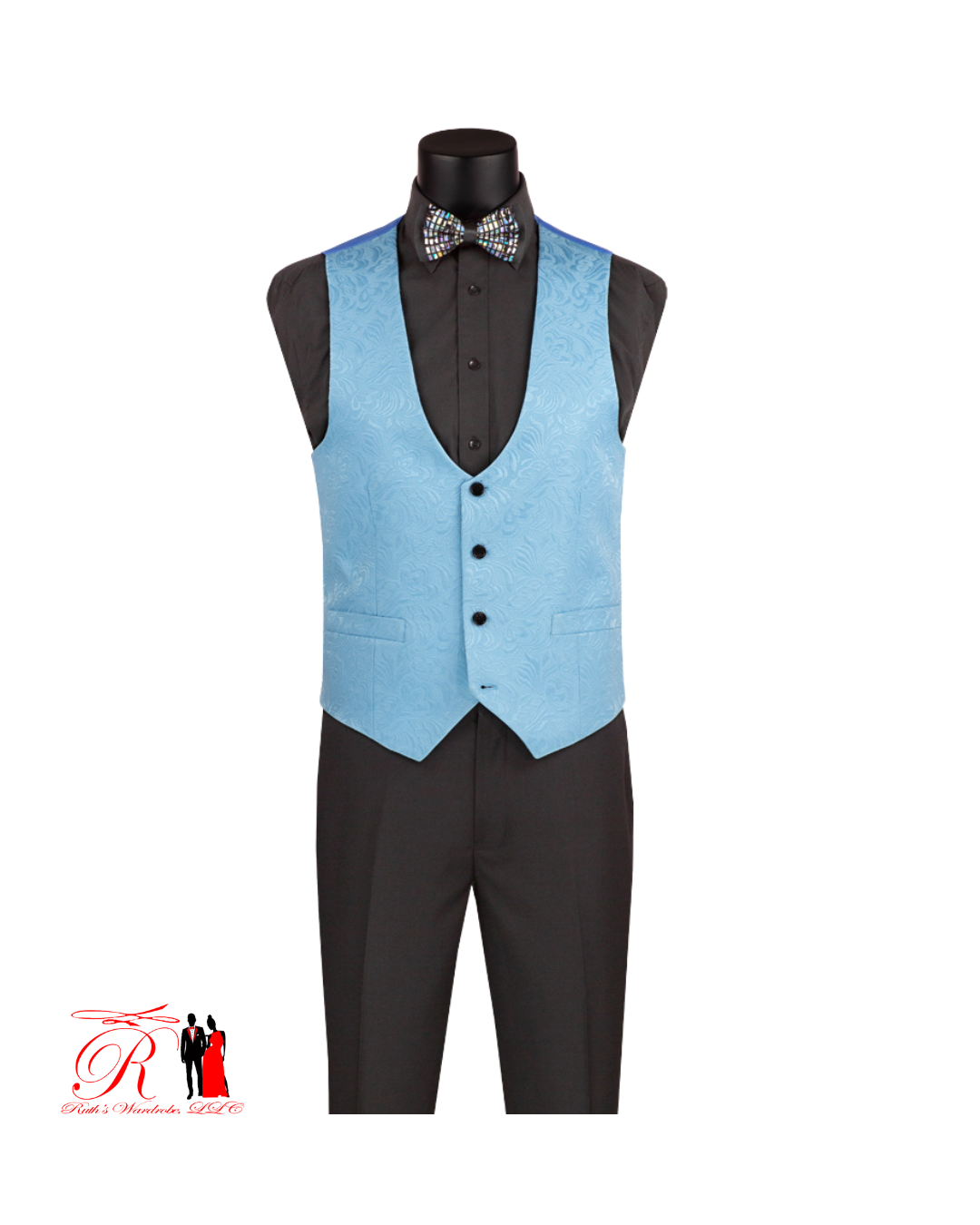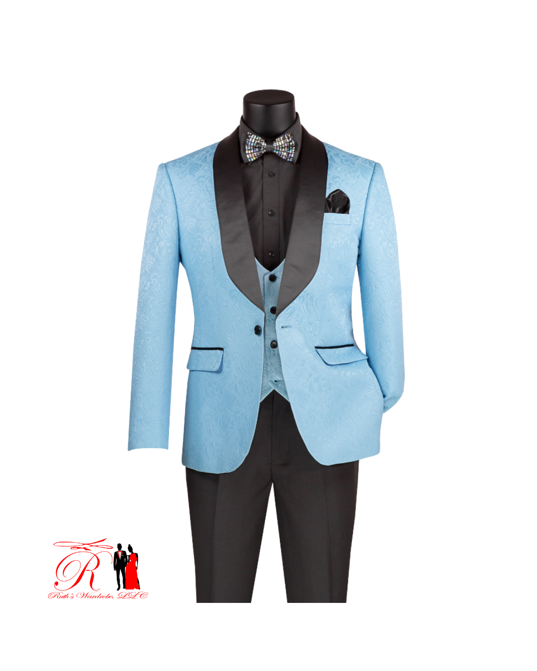 Make a bold statement with this Slim Fit Fashion Pastel Colored Tuxedos, designed in a rich jacquard fabric for standout style. The single-breasted, 1-button jacket features a sleek slim fit and side vents for comfort, while the coordinating vest adds extra refinement. Paired with solid black flat front pants, this 3-piece tuxedo delivers a modern, polished look perfect for weddings, proms, and formal occasions.